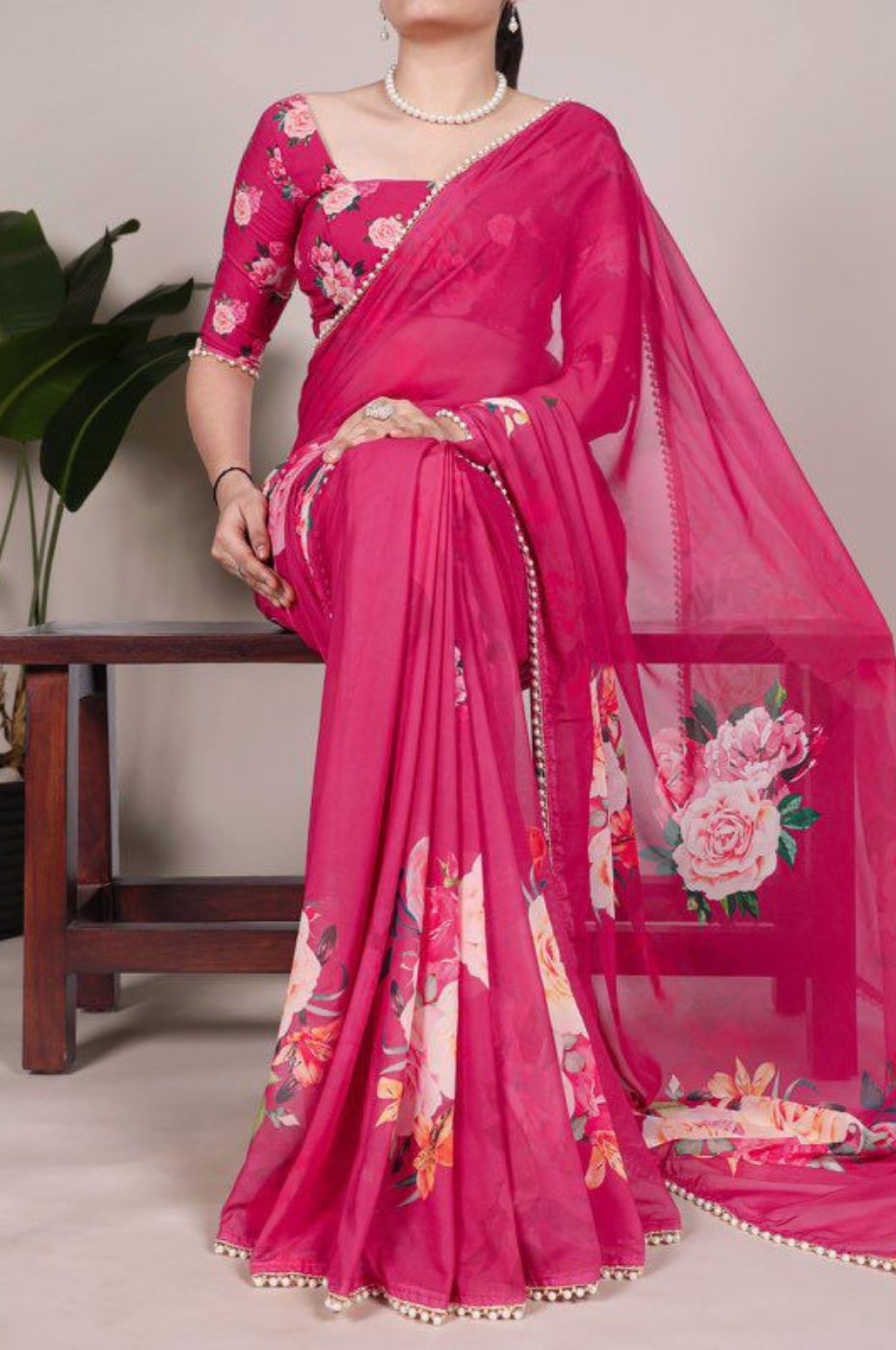 The best way to represent your classy look with this spectacular georgette printed saree with Pearl lace border✨.